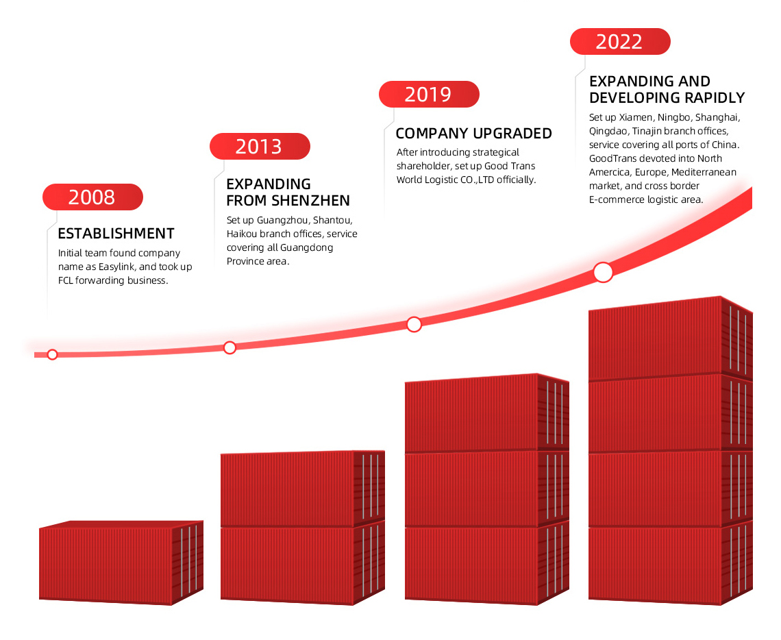Approved by Ministry of Communications,P.R.China as “Class A” global forwarding company, filed in Water Transport Department for NVOCC business, head office of Good Trans was founded in Shenzhen, the logistics hub of South China in 2008 and with home base in China, providing logistics service to int’l trade partners.